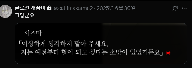내가 원래 씹덕질을 하는 이유가 씹덕 컨텐츠에는 내가 알수없는 사람사이의 상호작용같은 게 나오고 인물의 생각을 알수있으니까 (그리고 꼴리니까) 그런게 재밌어서 했던건데 정말 오랜만에 그 감각을 느낀다